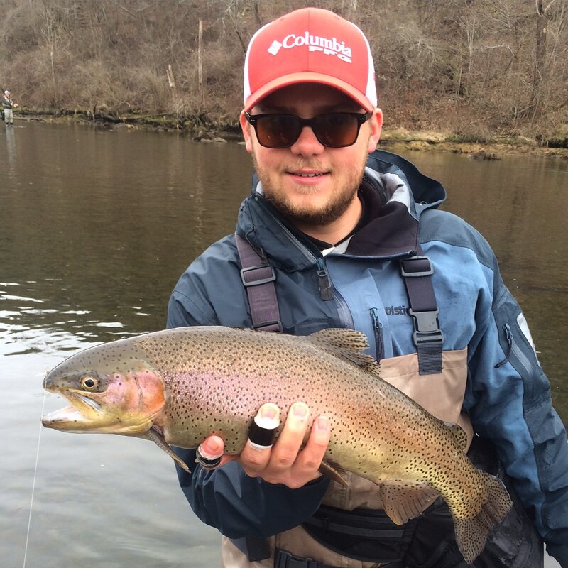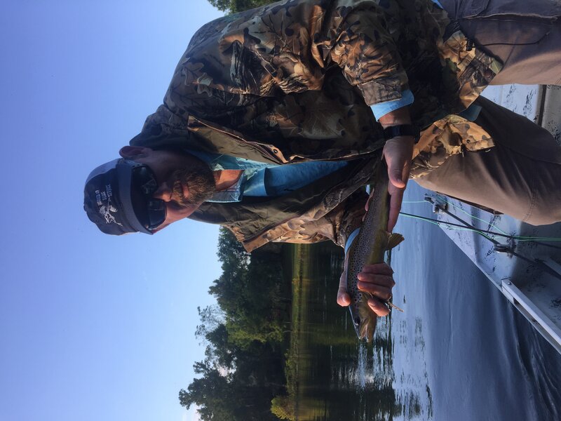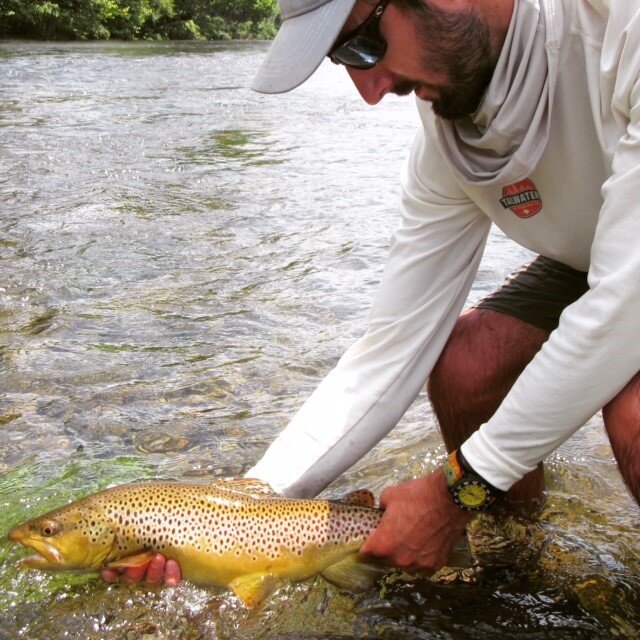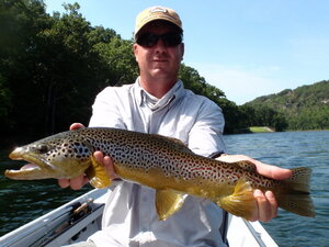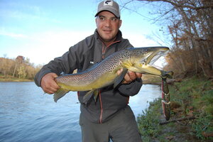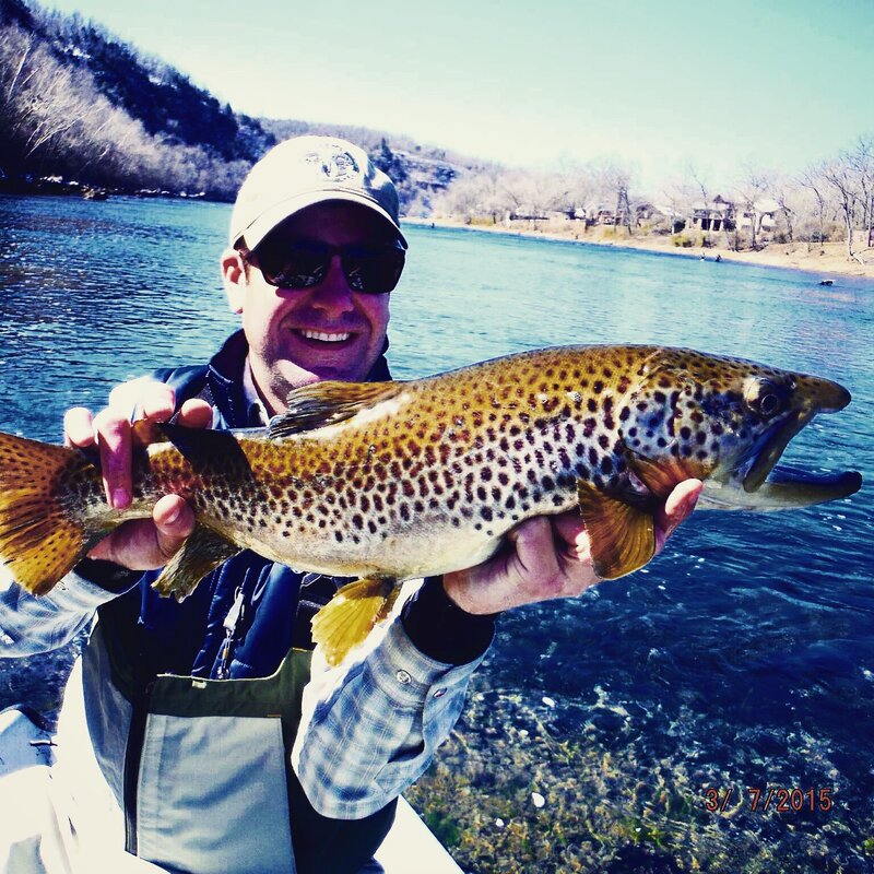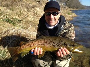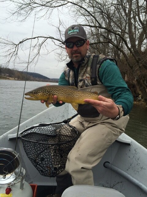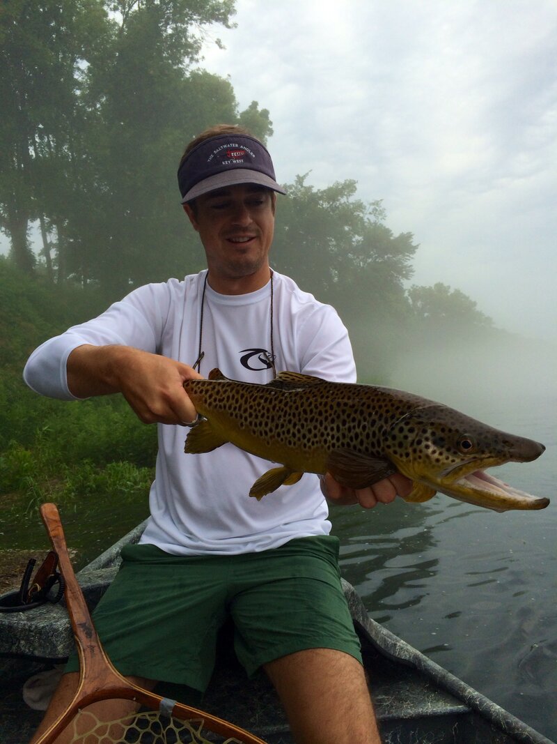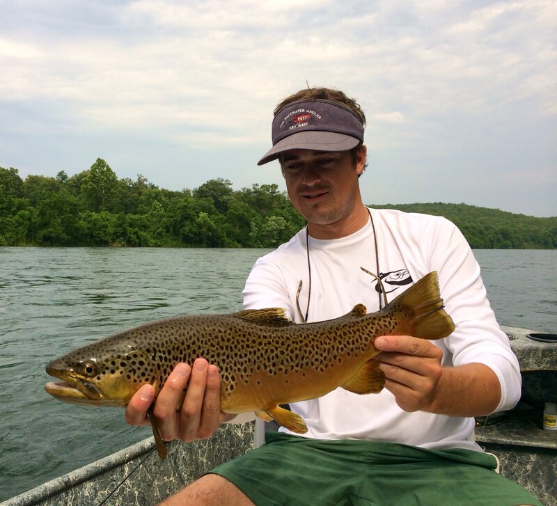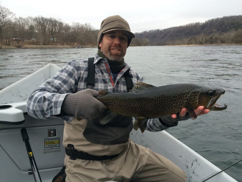 Joe Samluk with a nice 2 foot brown trout on a White River trip with Alex Lafkas