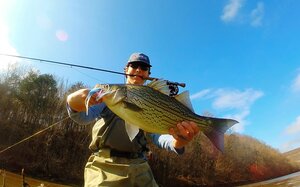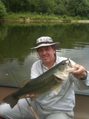 Chris Heppel with a monster largemouth bass on a popper: Crooked Creek guide trip with Chad Johnson